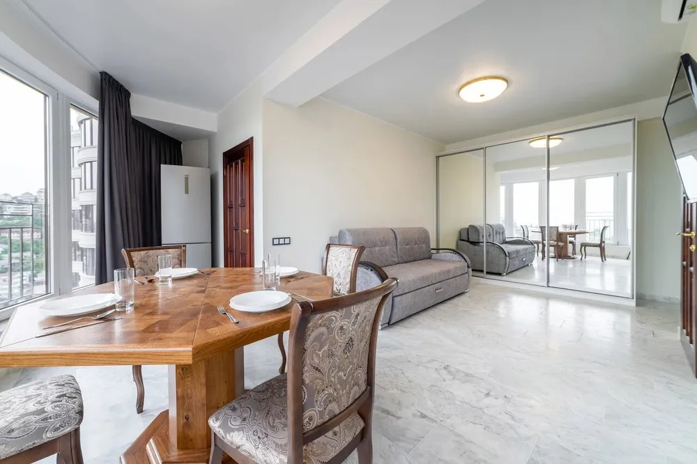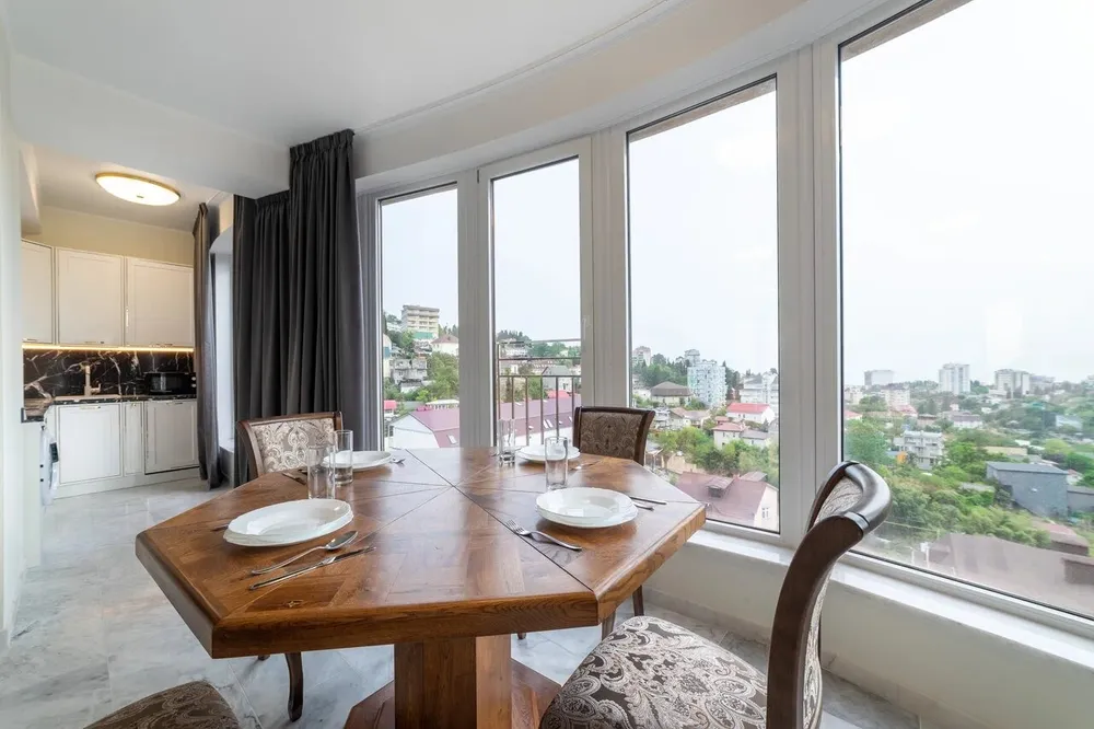 Светлые номера со стильными интерьерами и панорамным остеклением располагаются в современном комплексе с благоустроенной территорией. Жилой фонд включает несколько вариантов размещения, от уютной студии на двоих до просторных трехкомнатных апартаментов на шестерых. Все категории полностью укомплектованы мебелью и техникой, оснащены удобными спальными местами, кухонной и обеденной зонами, санузлом с душевой. Везде гости могут подключиться к Wi-Fi.